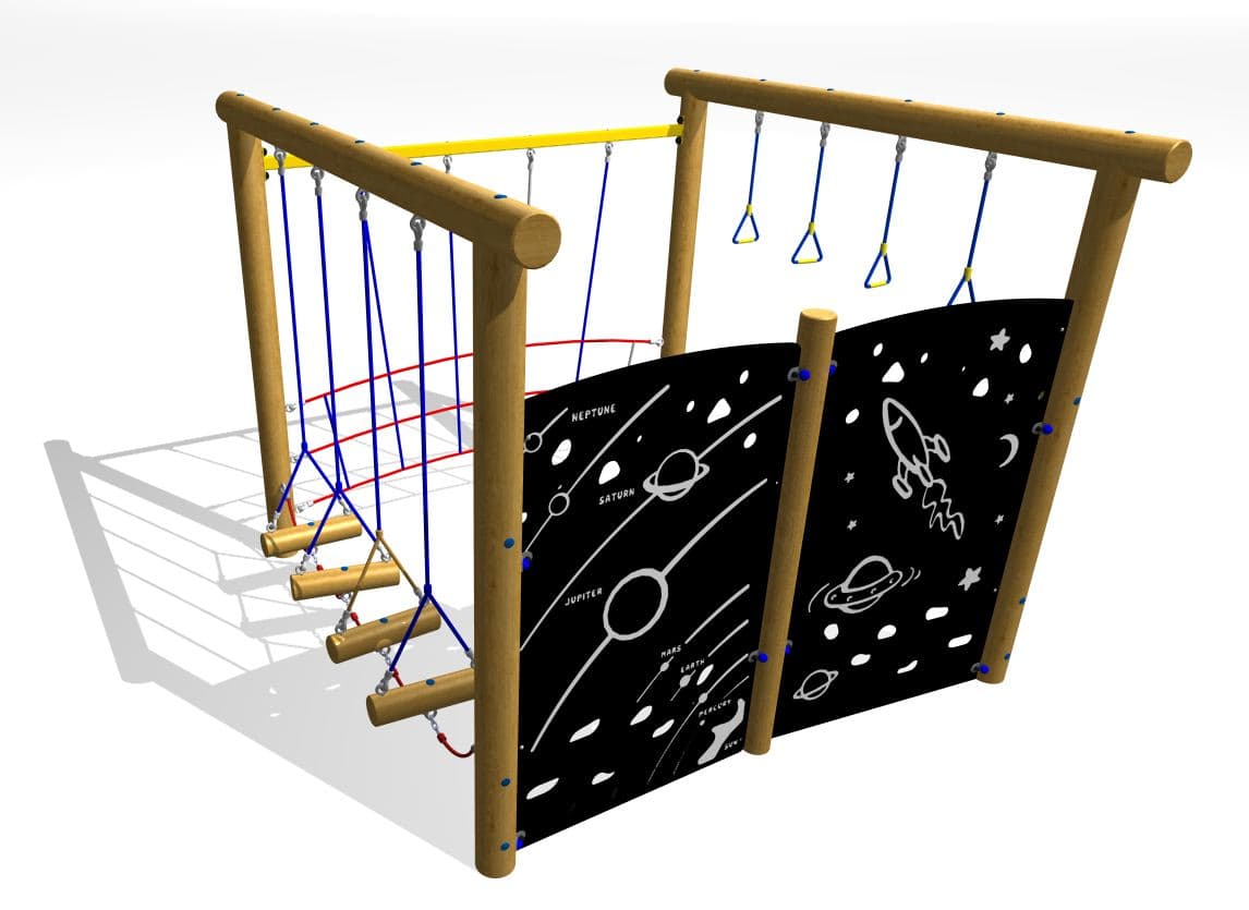 A low level timber play frame featuring 4 different challenges. The Explorer provides your children with a variety of physical developmental challenges covering upper and lower body strength, hand strength, task and gross motor skill development. The combination of equipment makes this challenge a group one, encouraging cooperation, competition, and imaginative play. This fosters relationships, develops communication skills, and builds confidence through teamwork and fun.