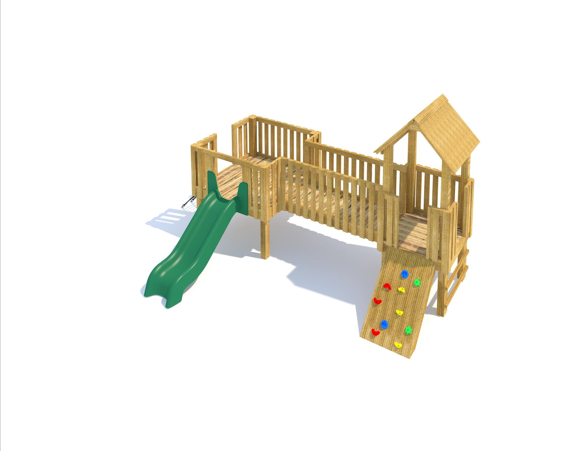The slide is a fun exit point for the children to take turns and slide down further developing their communication and spoken language. It includes a timber bridge crossing with open fence sides to provide plenty of space for moving and fun imaginative games. There is also plenty of space on top of the Tower for reading and storytelling.