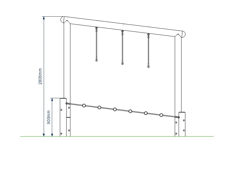 6 foot-treads suspended between a reinforced tightrope cross, with 2 vertical grip ropes hanging from a timber beam above to help guide the way across: the perfect challenge for thrill-seekers and those with big imaginations!