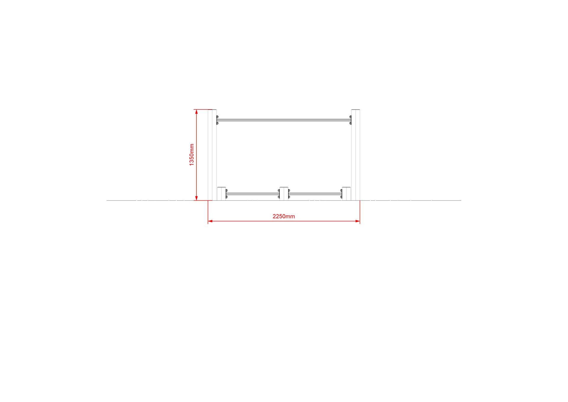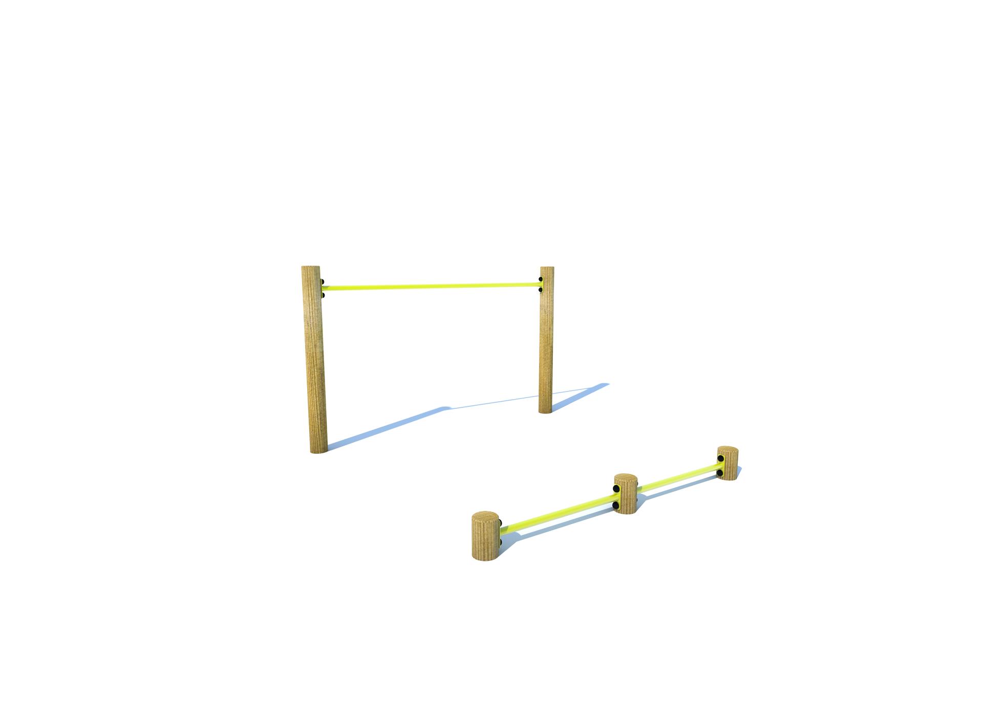 A set of two low handrails for push ups and one high handrail for either reduced resistance push ups and or stretching. Supported off timber posts.