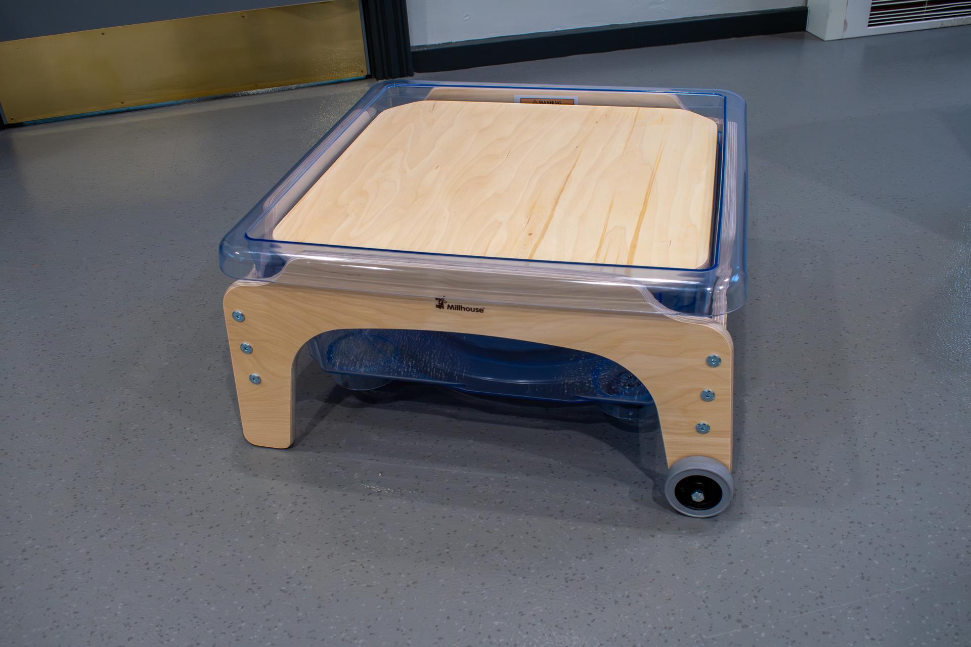 Each station is provided with a wooden lid which can be used to cover the tub when not in use offering a workspace on which to play.