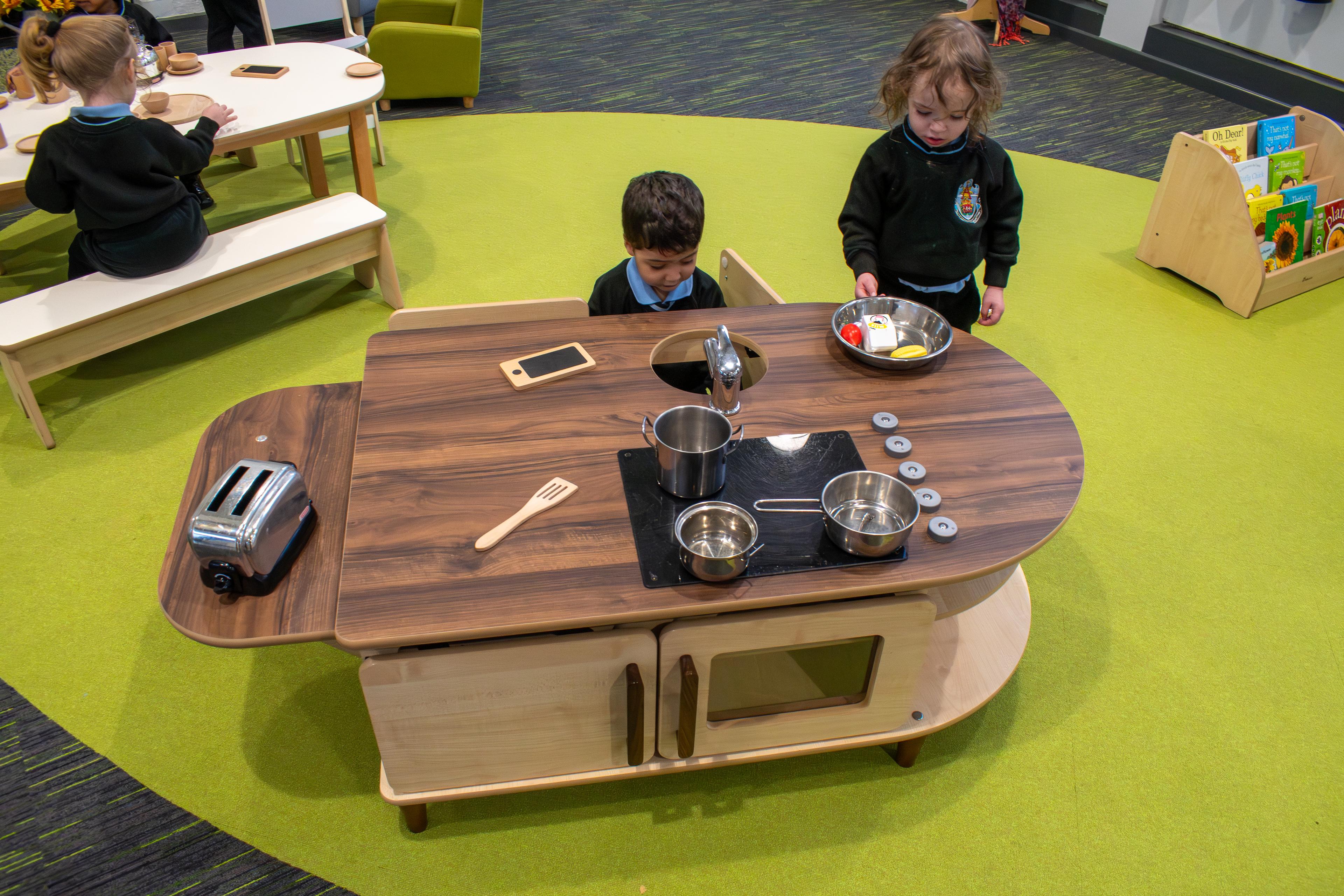 Ideal for children aged 18 months and up, the Millhouse Grantham Kitchen Set encourages communication, role play and social learning as children share ideas and act out everyday scenarios together. Whether it’s “cooking dinner’, “washing up” or “putting food in the fridge”, this inviting play kitchen creates a warm and engaging focal point in nurseries, preschools or home learning spaces.