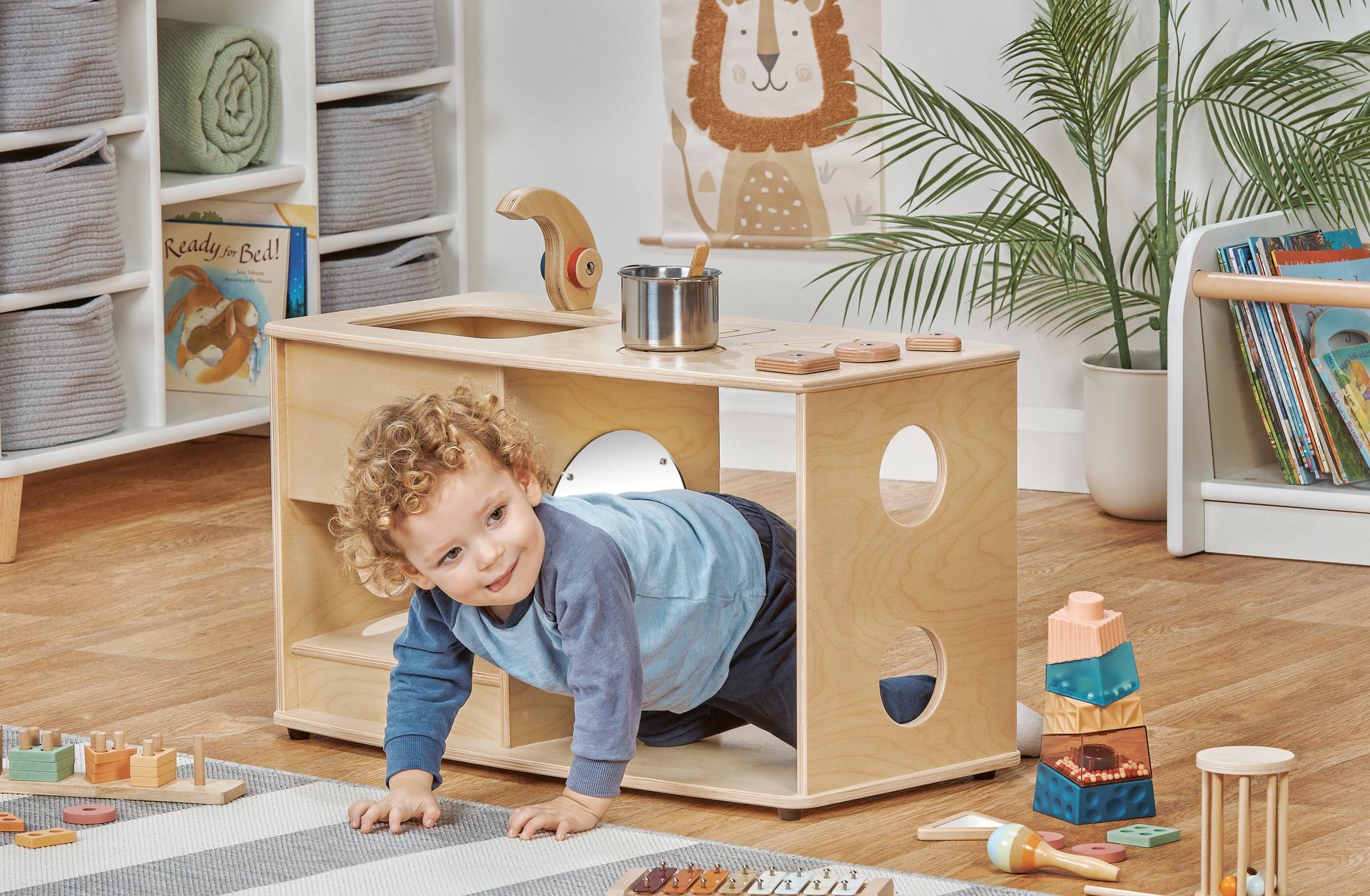 A circular mirror in the crawl-through section of the kitchen and a large sensory, rectangular mirror on the back of the unit support learning and development. Mirrors used during tummy time and when crawling help to develop muscles and physical abilities.