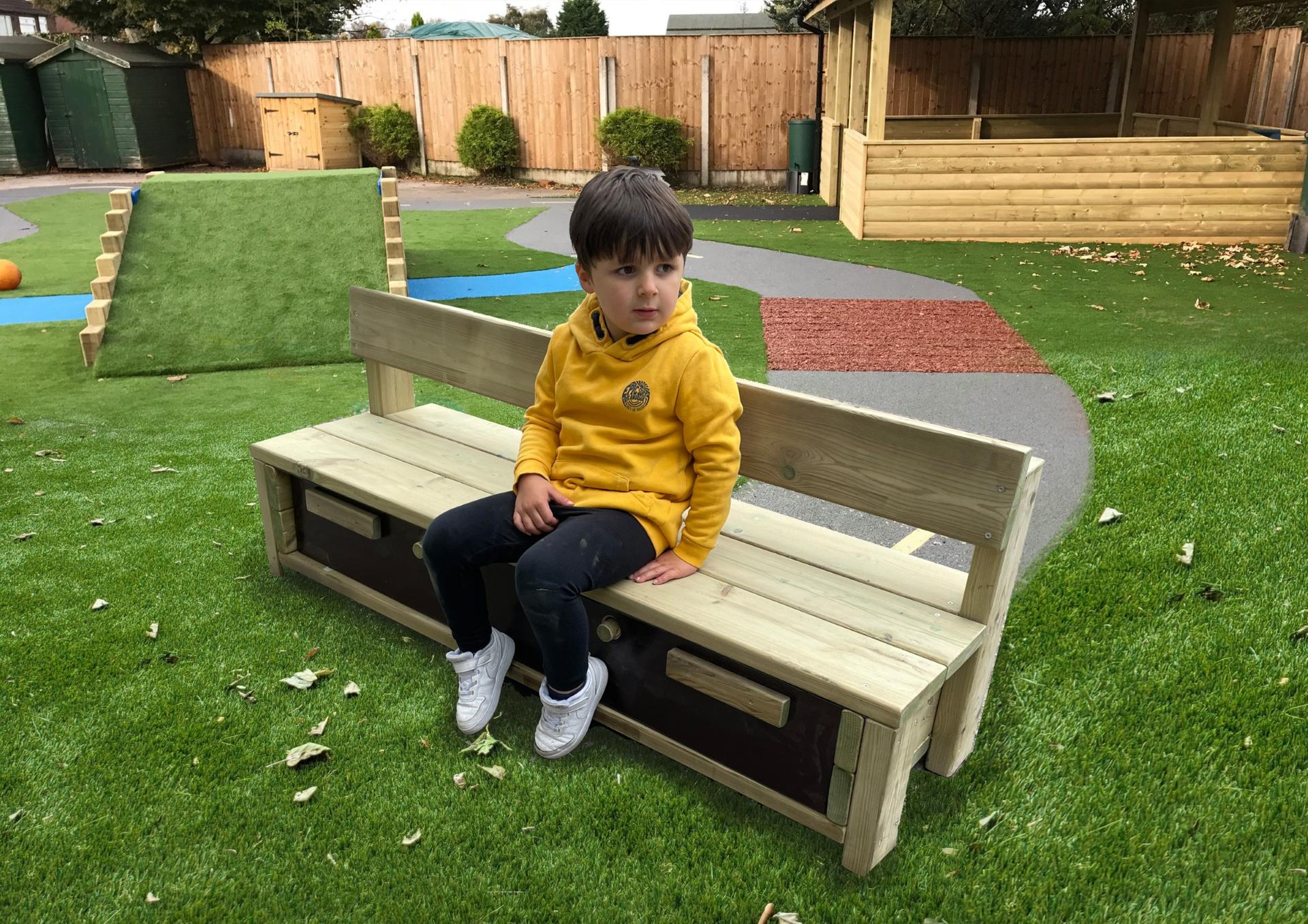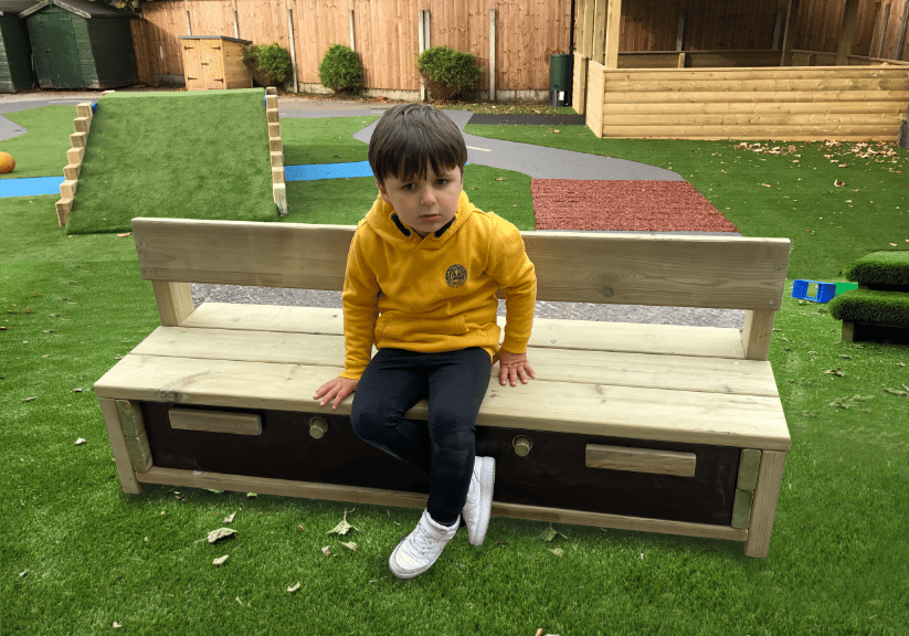 The bench seats between 4-5 children at one time, and includes a large storage section, made up of 3 boxes, where children can easily self-select resources independently.
