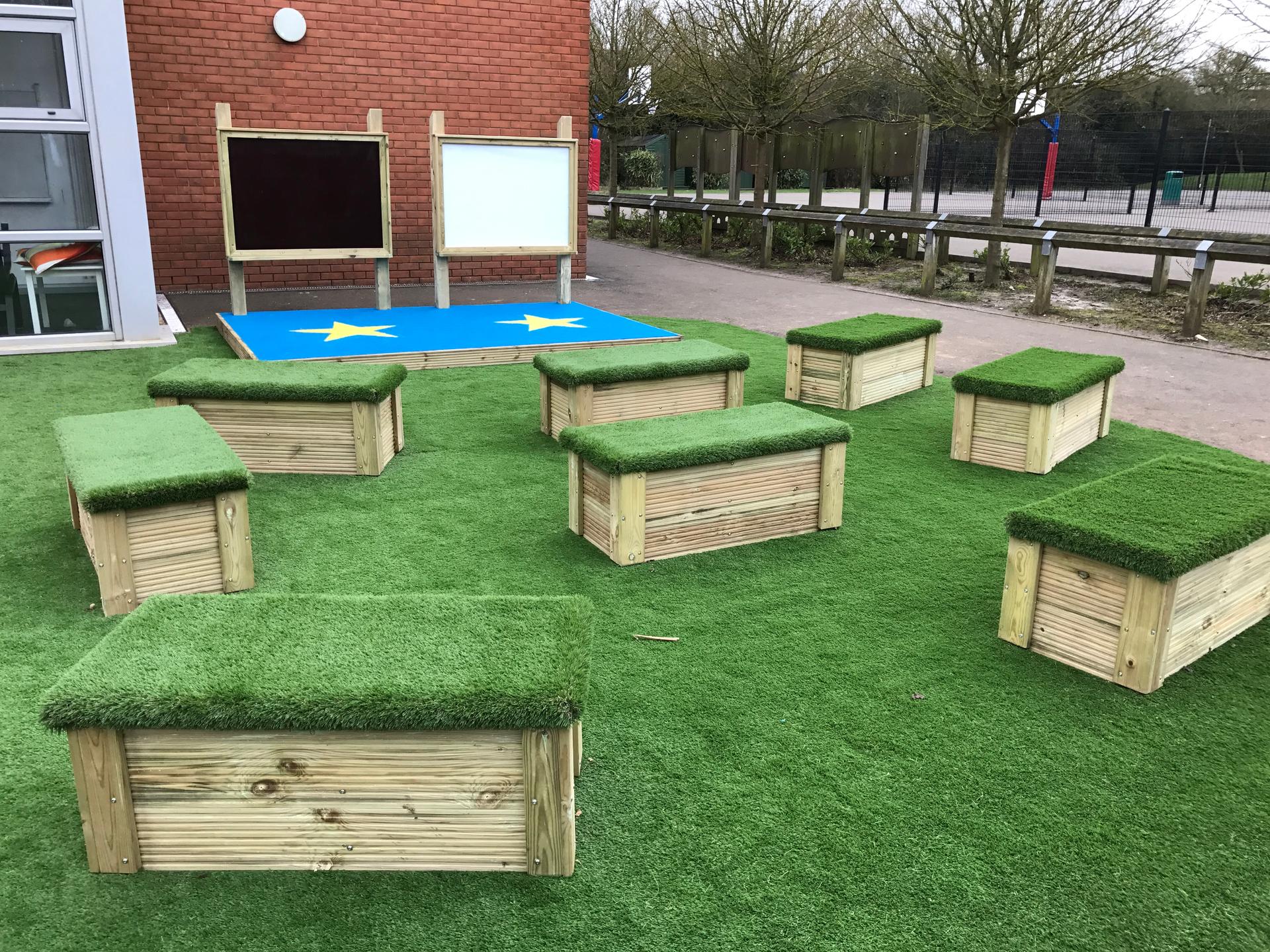 Our Large Moveable Artificial Grassed Top Seats will help create an eye-catching seating environment. This can be for storytelling time, lunch, outdoor lessons or even a place for children to socialise during play and learning. The green colour of the artificial grass promotes a love of nature, growth and relaxation, giving your children a much more pleasant seating experience. The bristles of the artificial grass will also engage children with special educational needs as they run their fingers through the bristles of the grass.