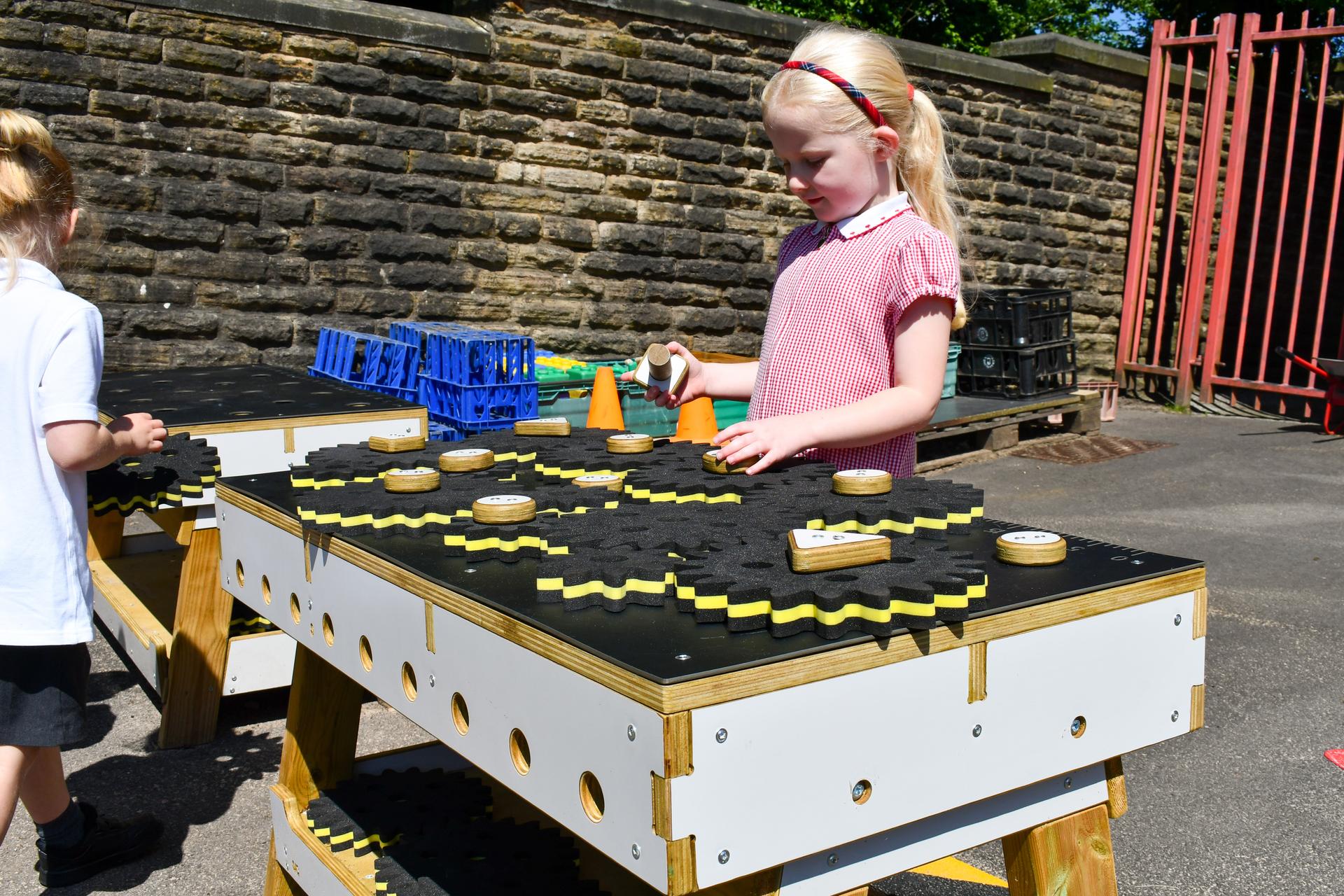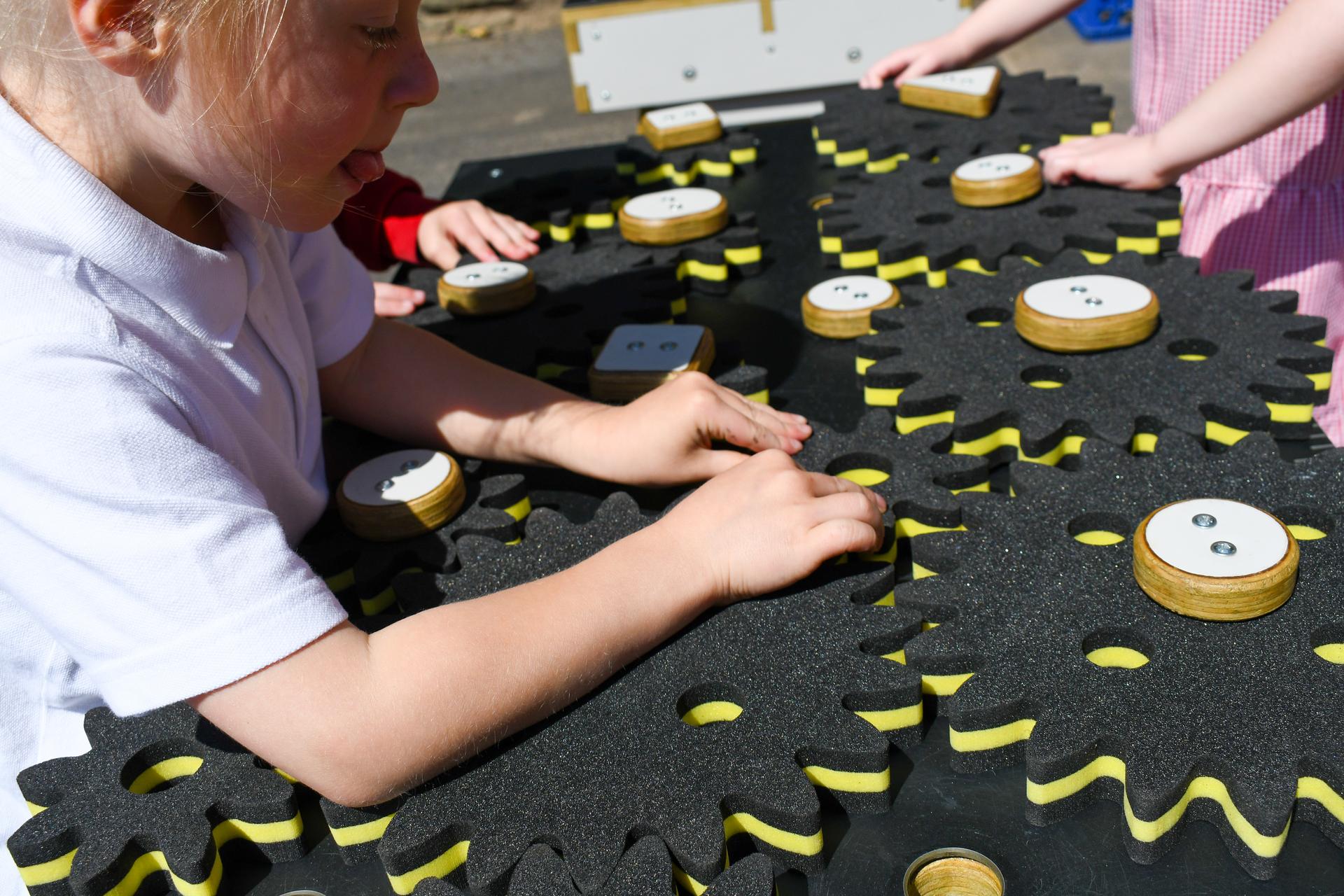 Low-level table with turnable foam cogs to encourage STEAM Learning.