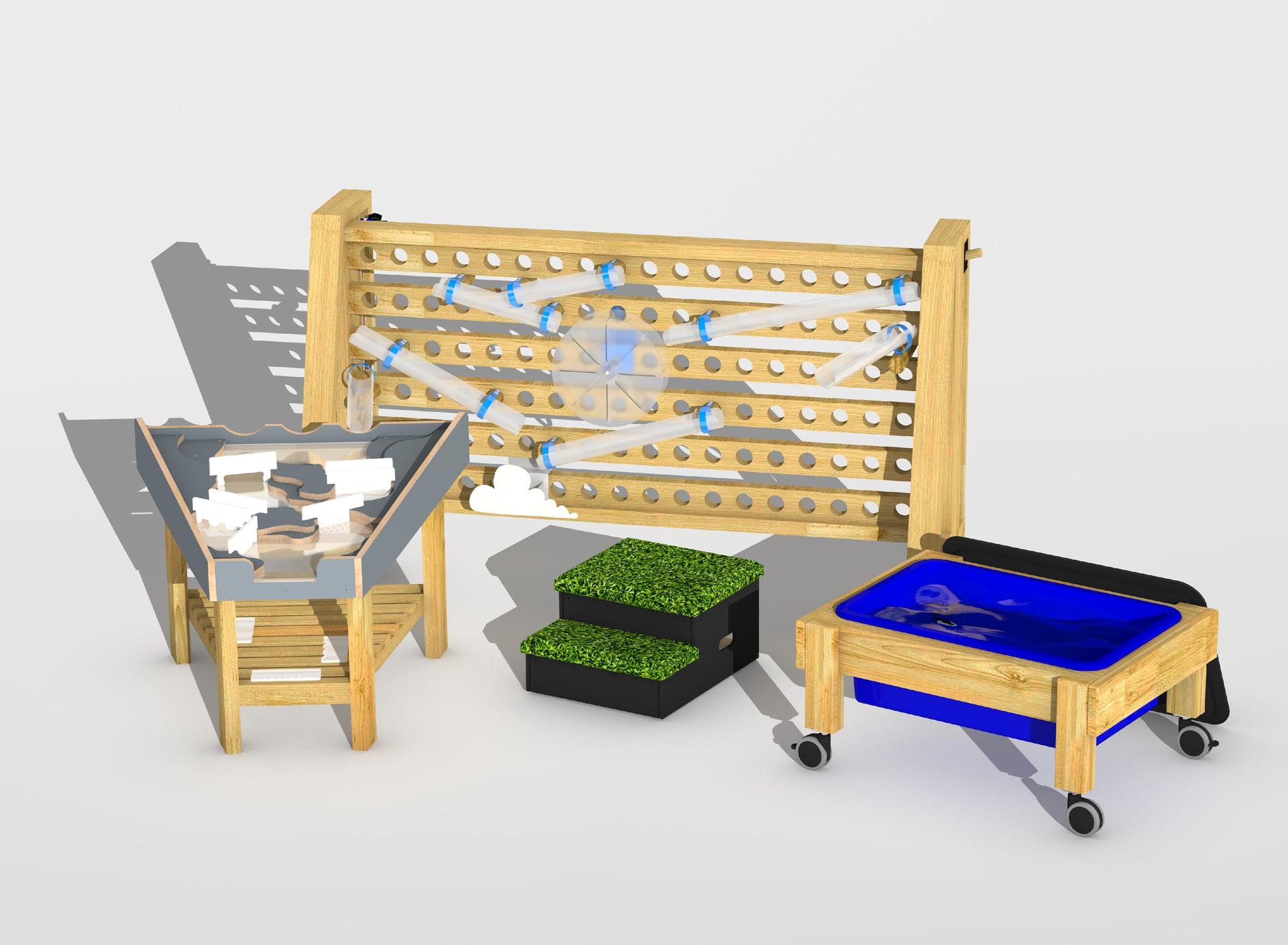 Children can begin by pouring and guiding water through the Movable Water Wall, watching it twist through channels and spin the wheel as they experiment with direction and flow. The journey continues at the Damming Station, inspired by the River Avon, where children can slot in configurable dams, test different materials and work together to control and redirect the water. The Water Table on wheels keeps the play cycle going, providing the perfect space for collecting, scooping and sensory exploration.