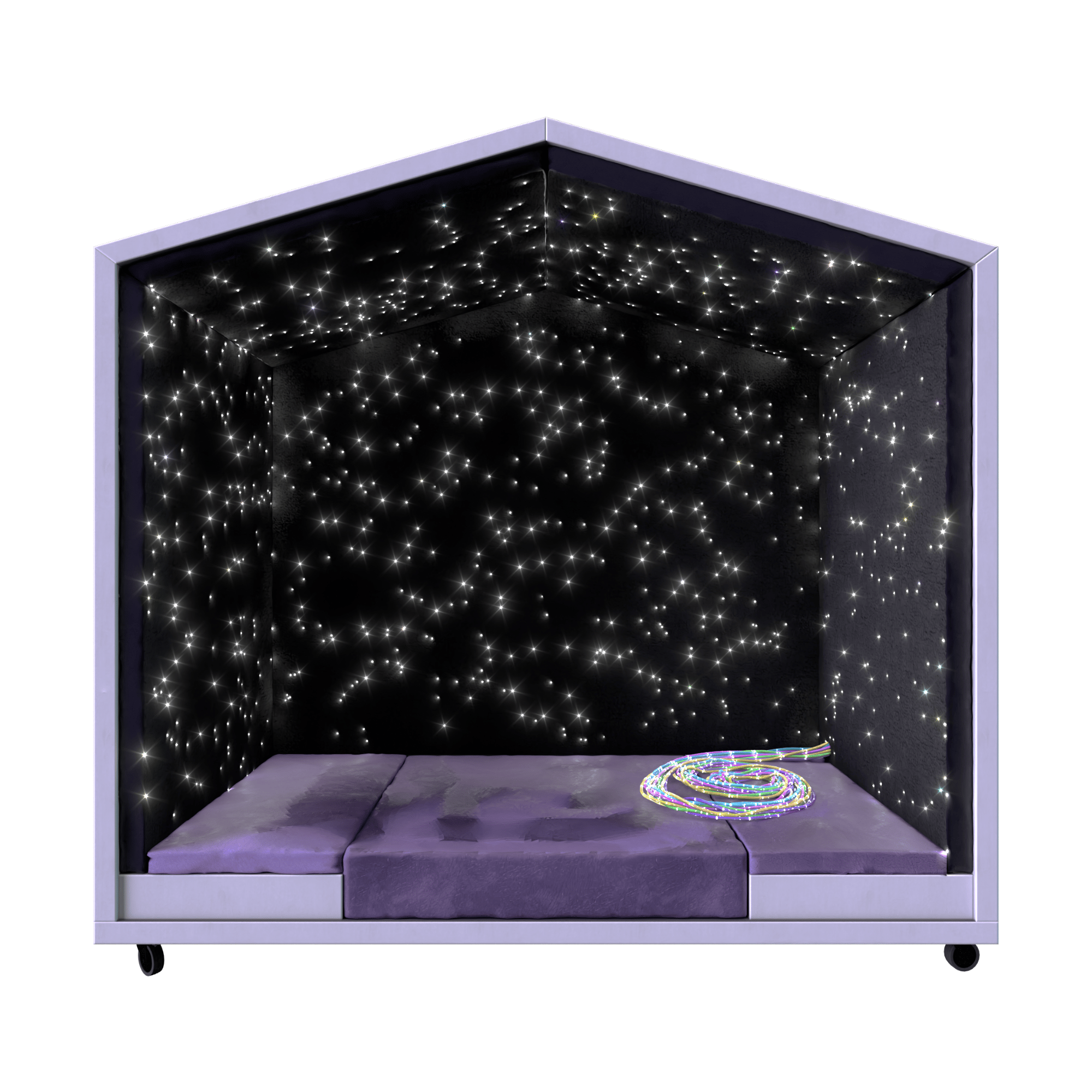 The "Sensory Nook – Shelter (Large)" features full height twinkling fibre optic wall carpet and dual colour changing lighting with intuitive controls, providing calming visual stimulation. Interactive activity panels add purposeful engagement, encouraging focus, curiosity and sensory exploration, while the built‑in Bluetooth sound system lets you play soothing audio or personalised playlists. Together, these features help children regulate emotions, reduce anxiety and build confidence through meaningful sensory play.