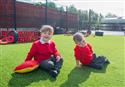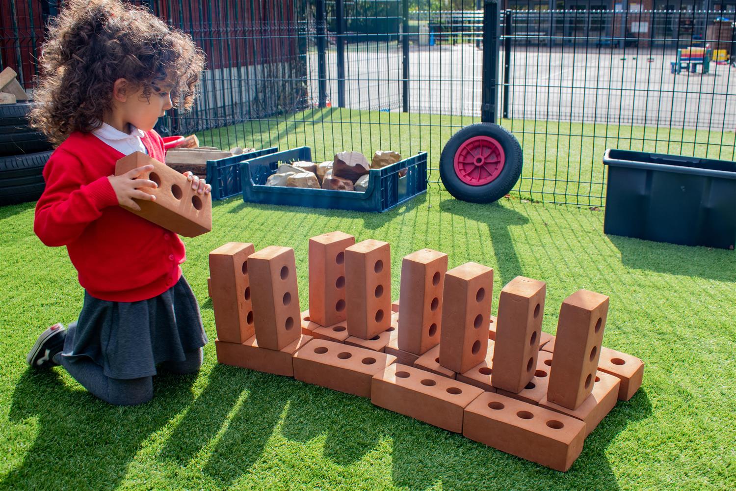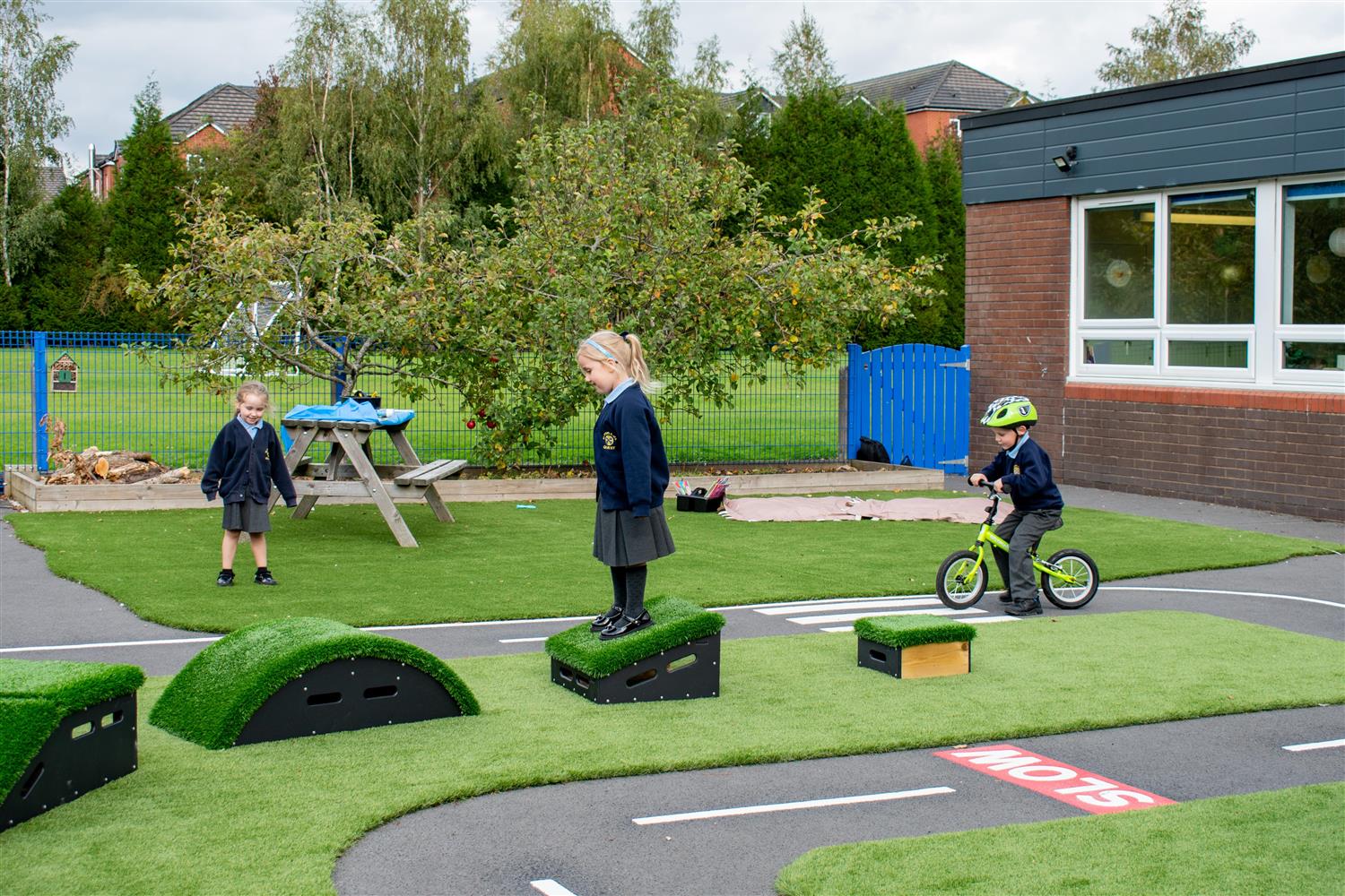 Featuring over 177m² of Playturf Artificial Grass (in mainly green with red and blue blobs scattered around), the new EYFS play area felt a lot more natural and free-flowing. Not only this, but the introduction of impact-absorbing artificial grass meant that children could engage in play with a massively reduced chance of significant injuries occurring (promoting risk play).