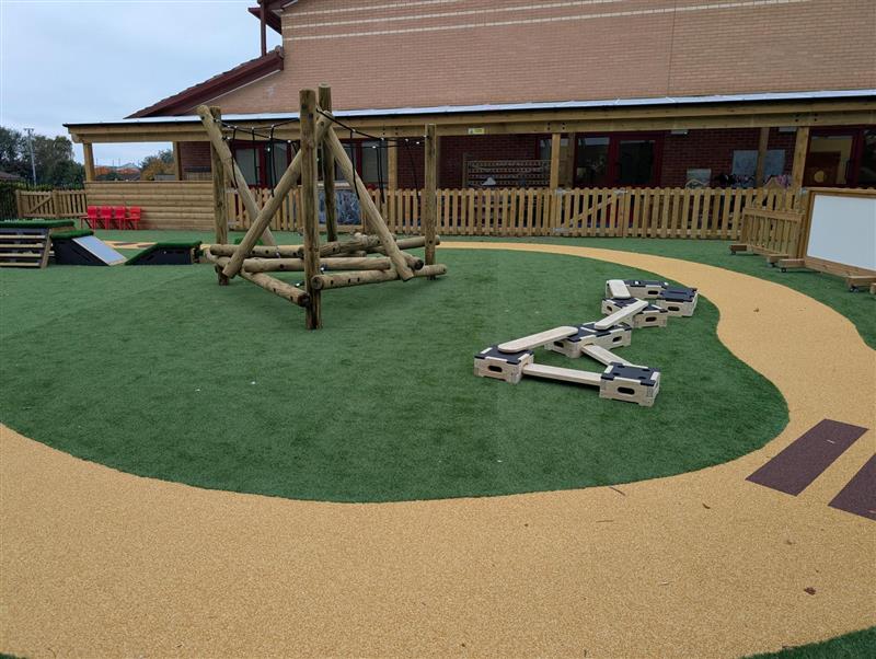 Freestanding active play resources such as the Get Set Go Blocks and Play Builder sets add further flexibility to the zone. These movable elements encourage children to construct their own obstacle courses, adapting the level of challenge to suit their ability. Together, the fixed and adaptable equipment create a dynamic physical development area that grows with the children using it.